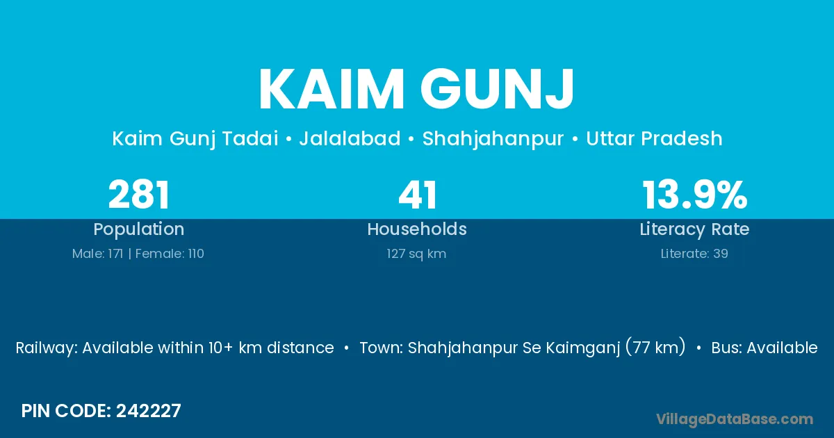 Shahjahanpur Se Kaimganj (77 km) is the nearest town to Kaim Gunj village for major economic activities and is located approximately 77 km away.