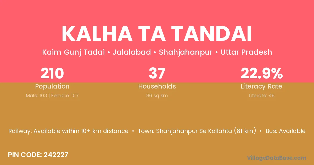 The literacy rate of Kalha Ta Tandai village is 22.86%. Male literacy stands at 33.98% and female literacy at 12.15%.