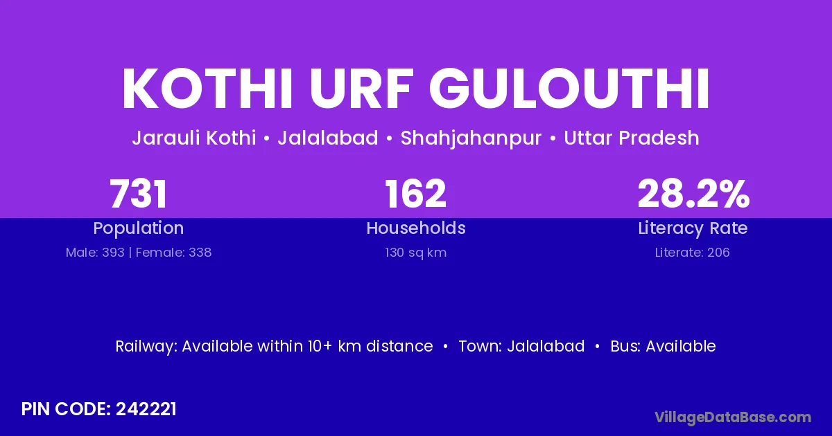 Kothi Urf Gulouthi village has a total population of 731 people, of which 393 are males and 338 are females.