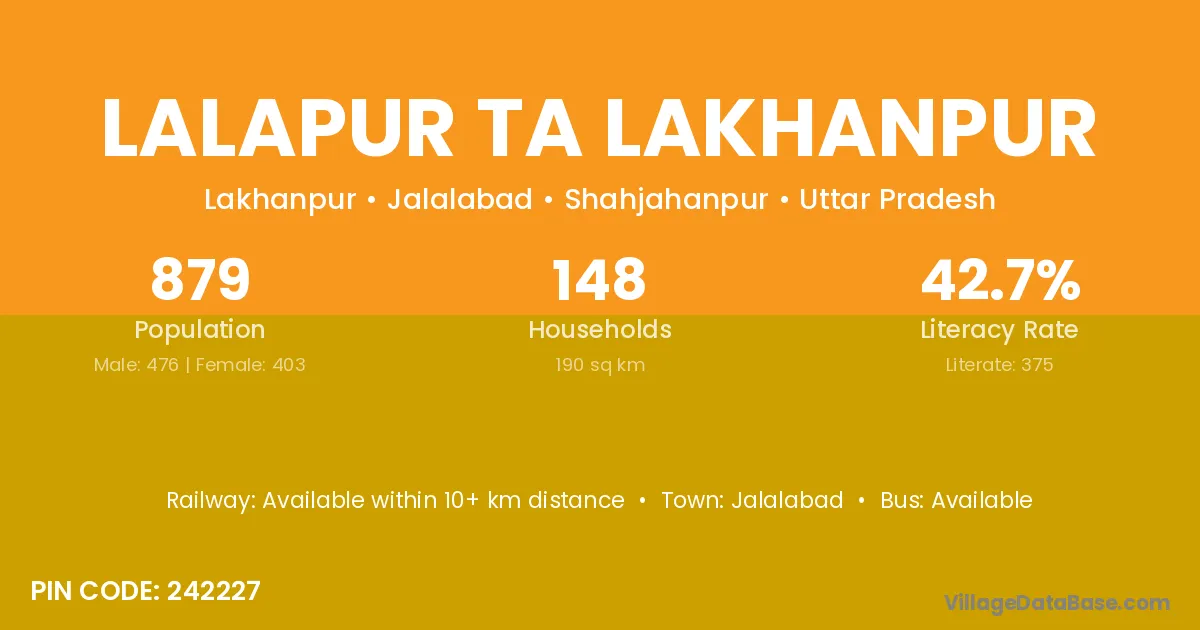 Lalapur Ta Lakhanpur village has a total population of 879 people, of which 476 are males and 403 are females.