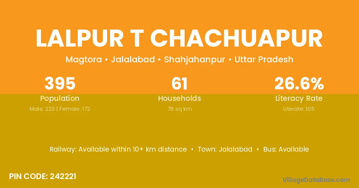 Lalpur T Chachuapur village has a total population of 395 people, of which 223 are males and 172 are females.