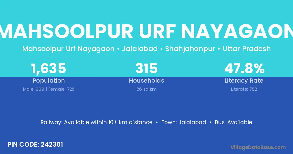 Jalalabad is the nearest town to Mahsoolpur Urf Nayagaon village for major economic activities