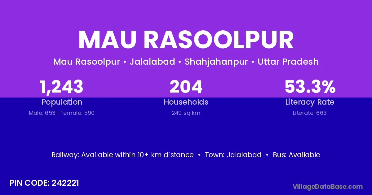 Mau Rasoolpur village has a total population of 1,243 people, of which 653 are males and 590 are females.