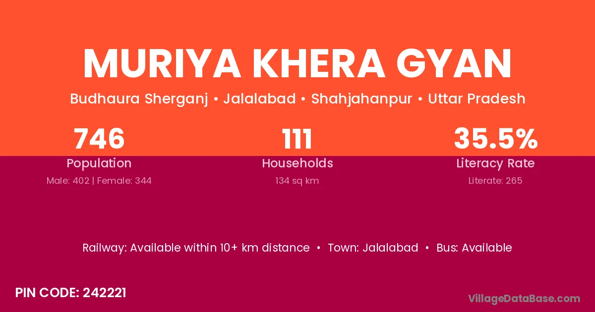 Muriya Khera Gyan village has a total population of 746 people, of which 402 are males and 344 are females.