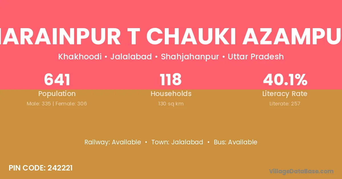 Narainpur T Chauki Azampur village has a total population of 641 people, of which 335 are males and 306 are females.
