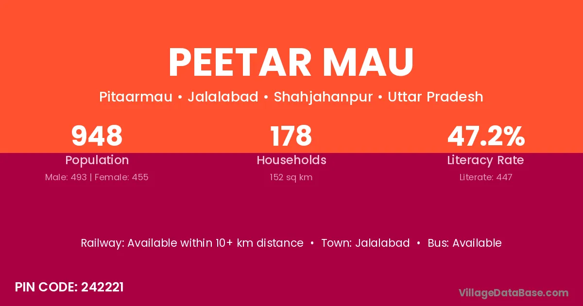 Peetar Mau village is located in the Jalalabad Tehsil of the Shahjahanpur district in Uttar Pradesh .