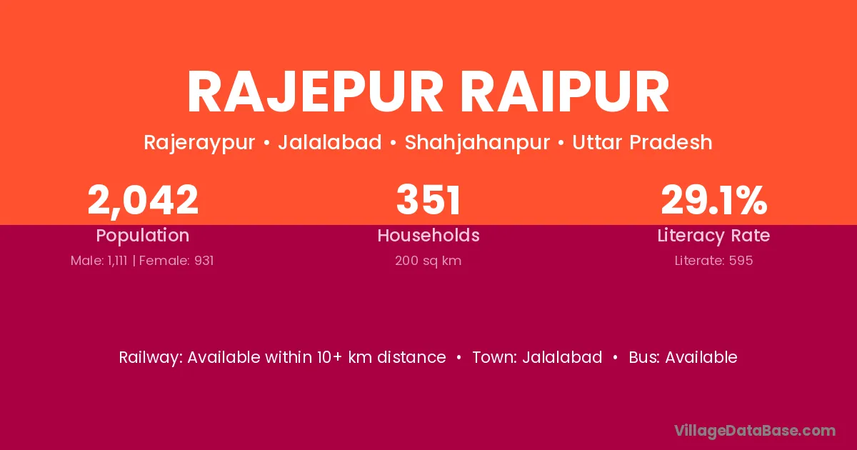 Rajepur Raipur village has a total population of 2,042 people, of which 1,111 are males and 931 are females.