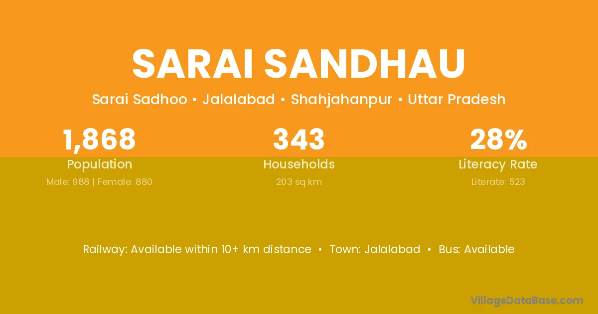The literacy rate of Sarai Sandhau village is 28.00%. Male literacy stands at 35.53% and female literacy at 19.55%.