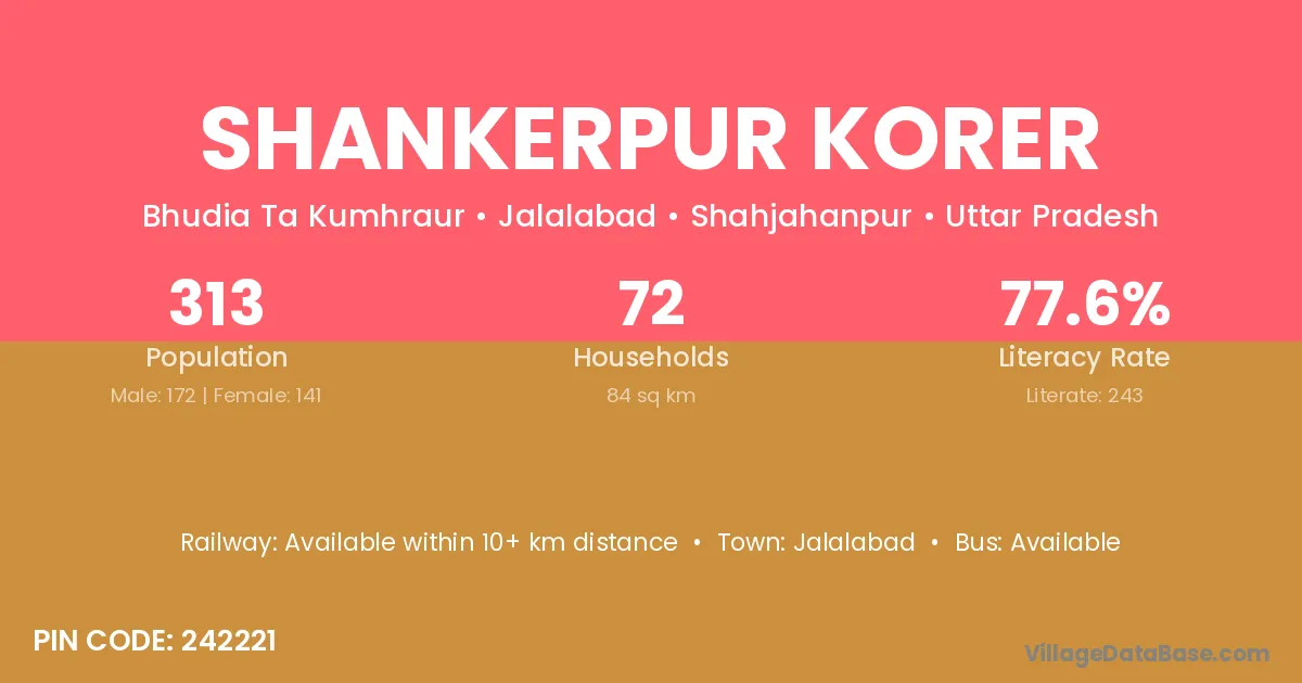 Shankerpur Korer village has a total population of 313 people, of which 172 are males and 141 are females.