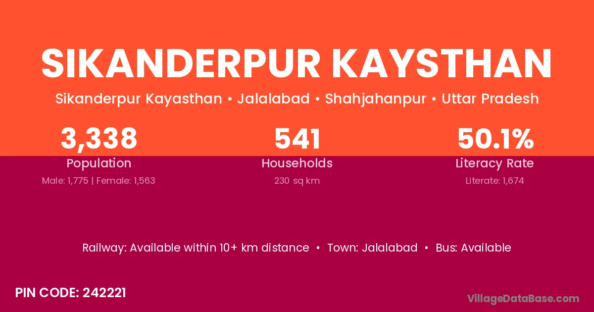 Sikanderpur Kaysthan village has a total population of 3,338 people, of which 1,775 are males and 1,563 are females.