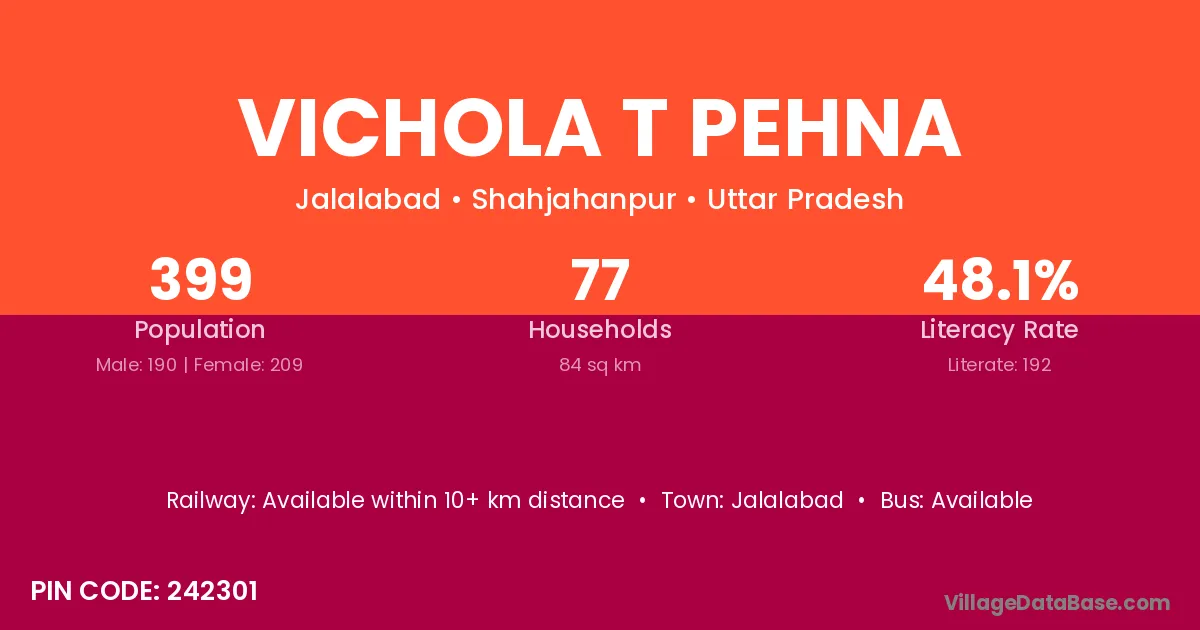 Vichola T Pehna village has a total population of 399 people, of which 190 are males and 209 are females.