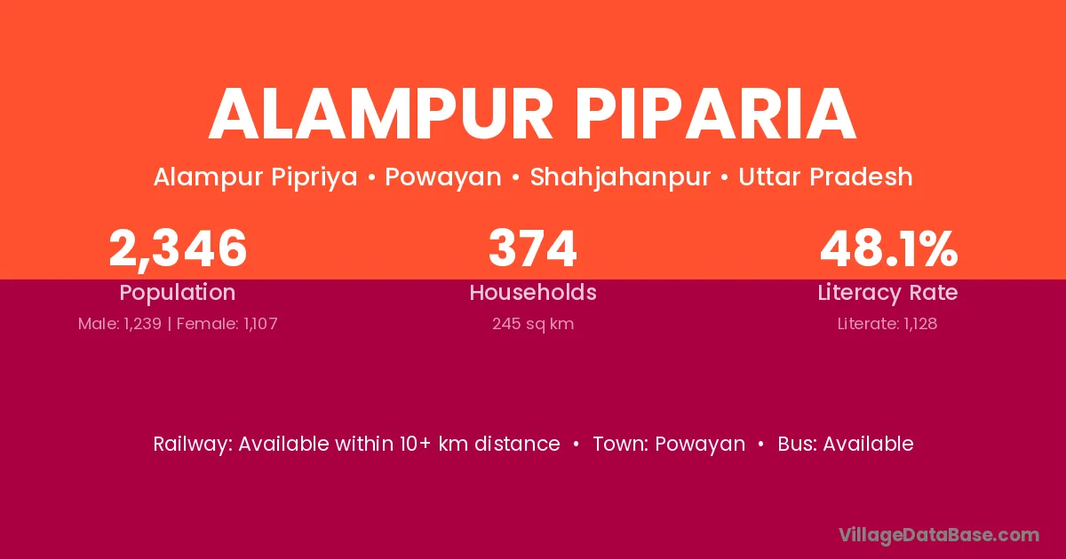 Alampur Piparia village has a total population of 2,346 people, of which 1,239 are males and 1,107 are females.