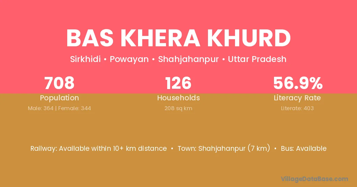 Shahjahanpur (7 km) is the nearest town to Bas Khera Khurd village for major economic activities and is located approximately 7 km away.
