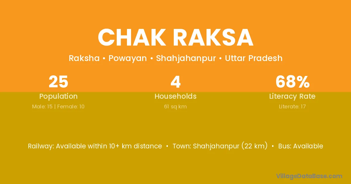Shahjahanpur (22 km) is the nearest town to Chak Raksa village for major economic activities and is located approximately 22 km away.
