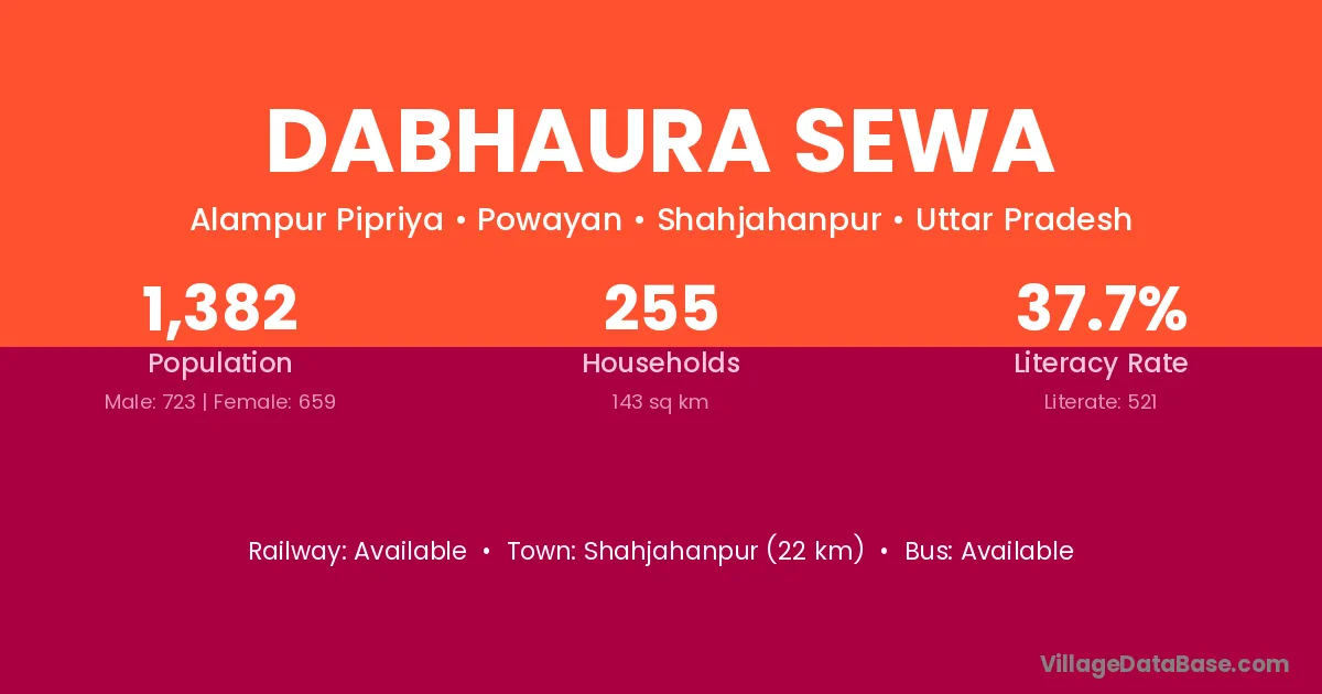 Dabhaura Sewa village has a total population of 1,382 people, of which 723 are males and 659 are females.