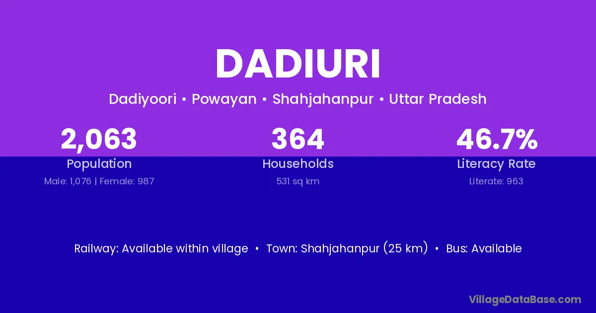 Shahjahanpur (25 km) is the nearest town to Dadiuri village for major economic activities and is located approximately 25 km away.