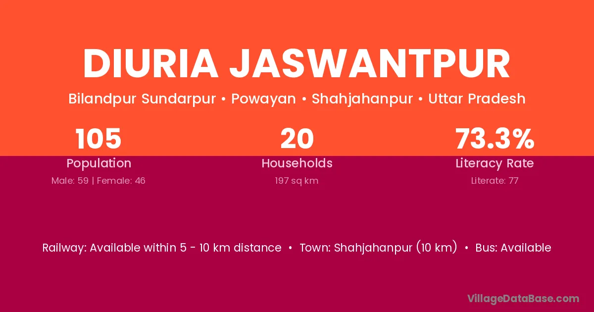 Diuria Jaswantpur village has a total population of 105 people, of which 59 are males and 46 are females.