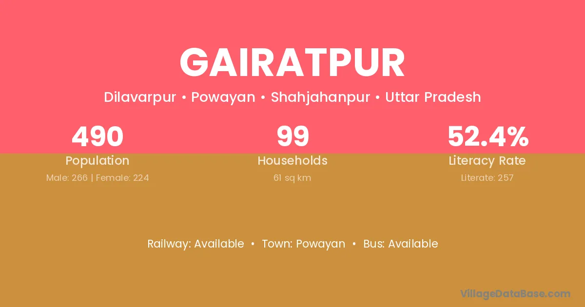 Gairatpur village has a total population of 490 people, of which 266 are males and 224 are females.