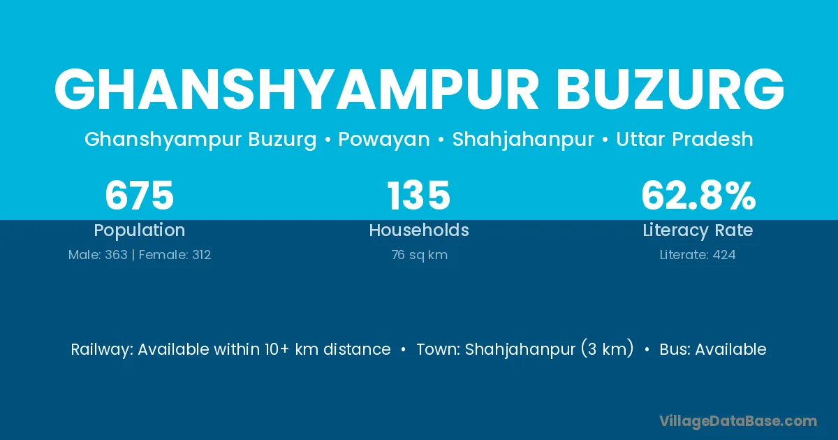 Shahjahanpur (3 km) is the nearest town to Ghanshyampur Buzurg village for major economic activities and is located approximately 3 km away.