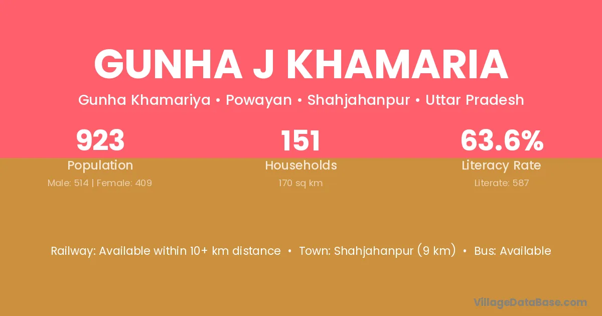 Gunha J Khamaria village has a total population of 923 people, of which 514 are males and 409 are females.