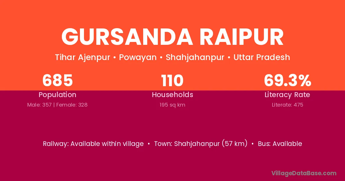 Gursanda Raipur village has a total population of 685 people, of which 357 are males and 328 are females.