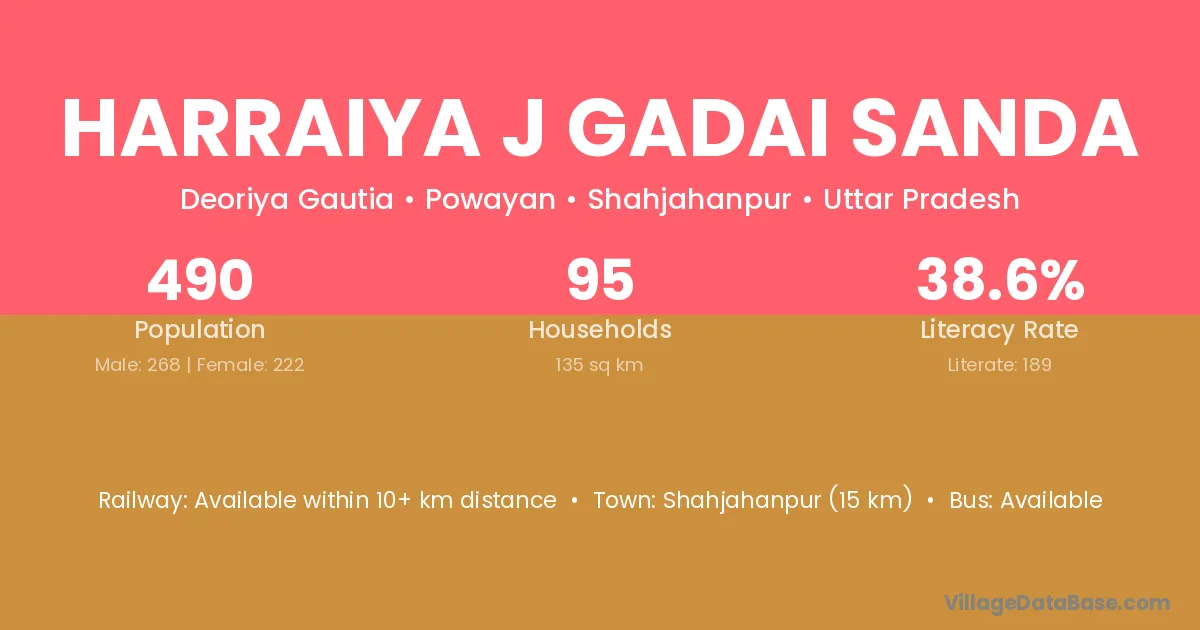 Shahjahanpur (15 km) is the nearest town to Harraiya J Gadai Sanda village for major economic activities and is located approximately 15 km away.