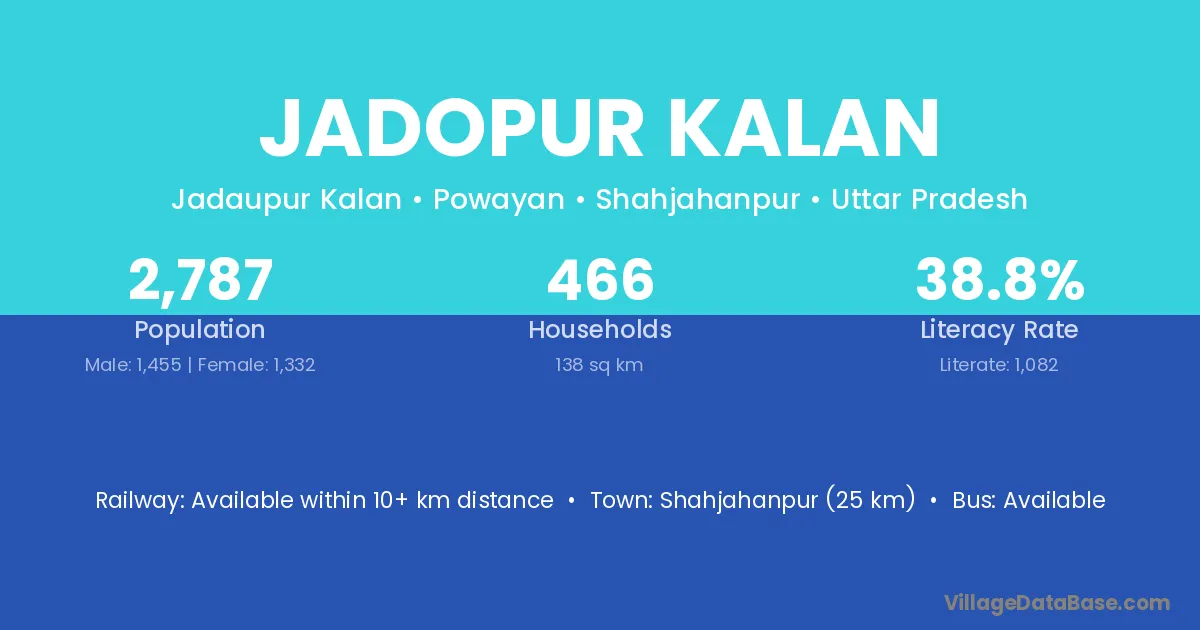 Shahjahanpur (25 km) is the nearest town to Jadopur Kalan village for major economic activities and is located approximately 25 km away.