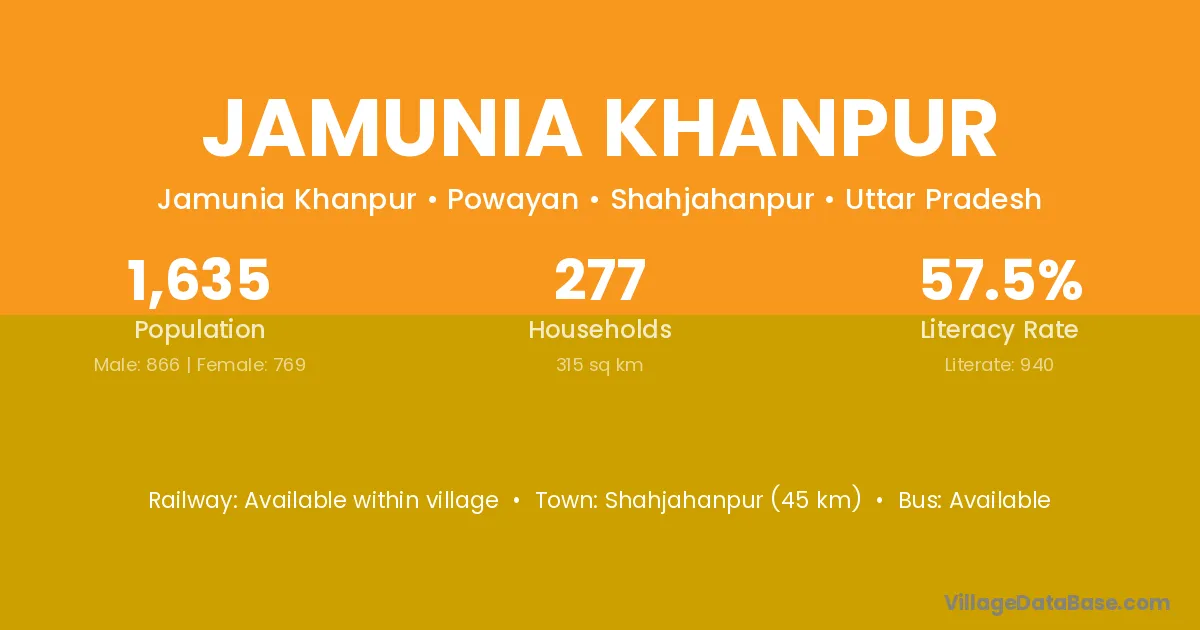 Shahjahanpur (45 km) is the nearest town to Jamunia Khanpur village for major economic activities and is located approximately 45 km away.