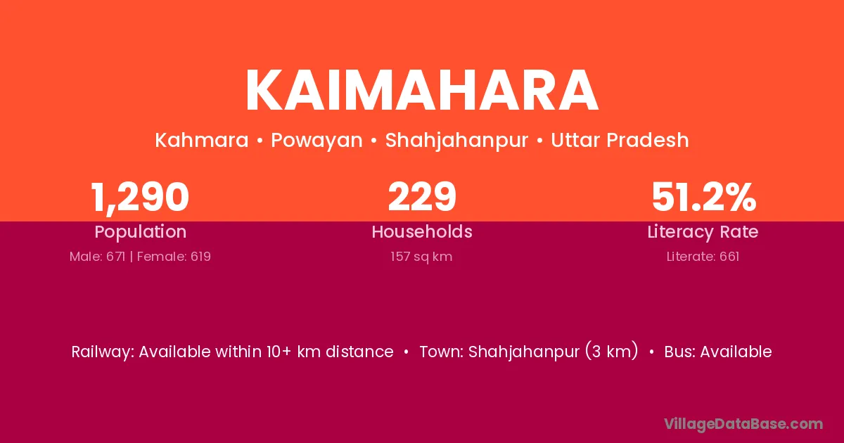 Shahjahanpur (3 km) is the nearest town to Kaimahara village for major economic activities and is located approximately 3 km away.