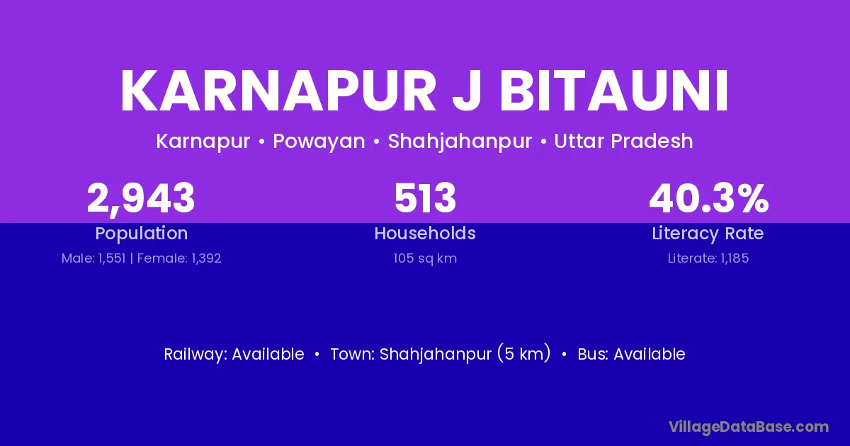 Shahjahanpur (5 km) is the nearest town to Karnapur J Bitauni village for major economic activities and is located approximately 5 km away.