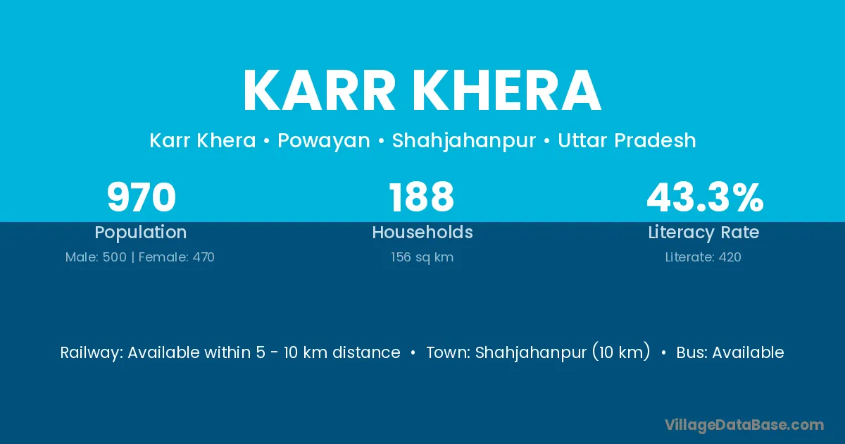 Karr Khera village has a total population of 970 people, of which 500 are males and 470 are females.