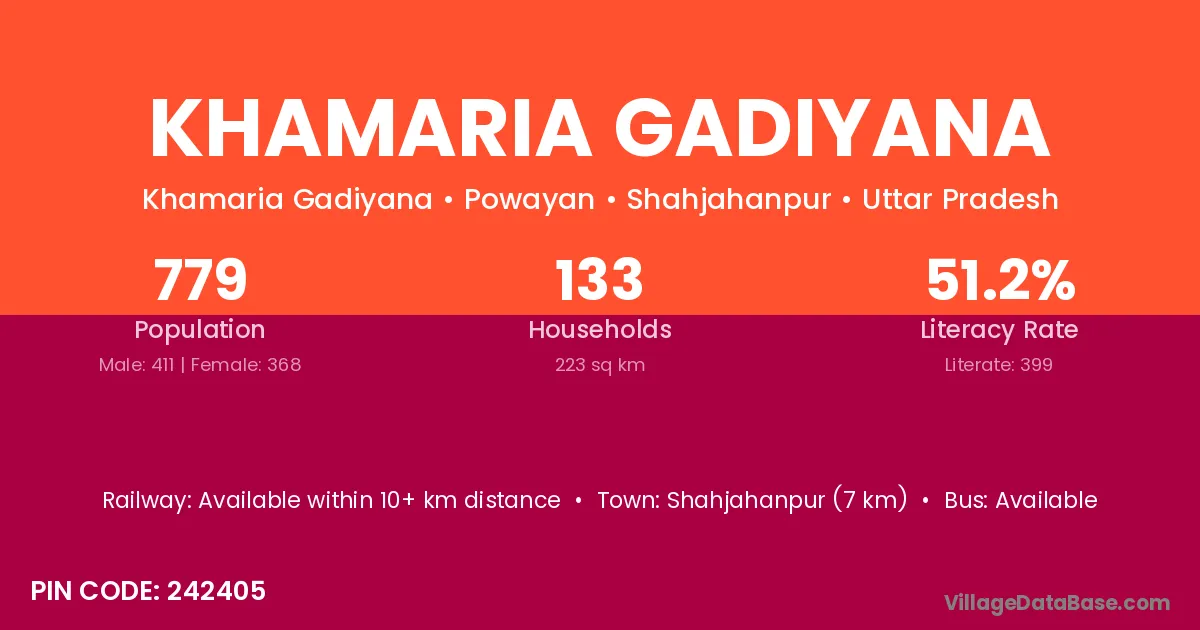 Khamaria Gadiyana village has a total population of 779 people, of which 411 are males and 368 are females.