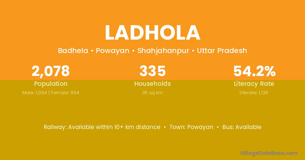 Ladhola village has a total population of 2,078 people, of which 1,084 are males and 994 are females.