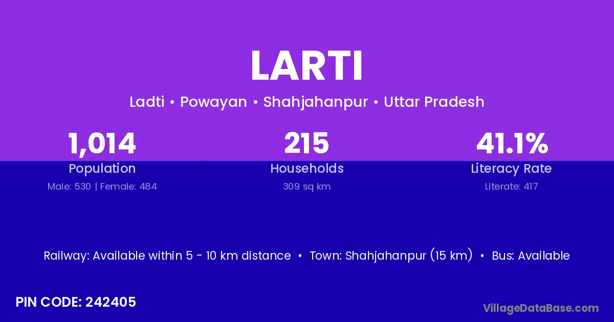 Shahjahanpur (15 km) is the nearest town to Larti village for major economic activities and is located approximately 15 km away.
