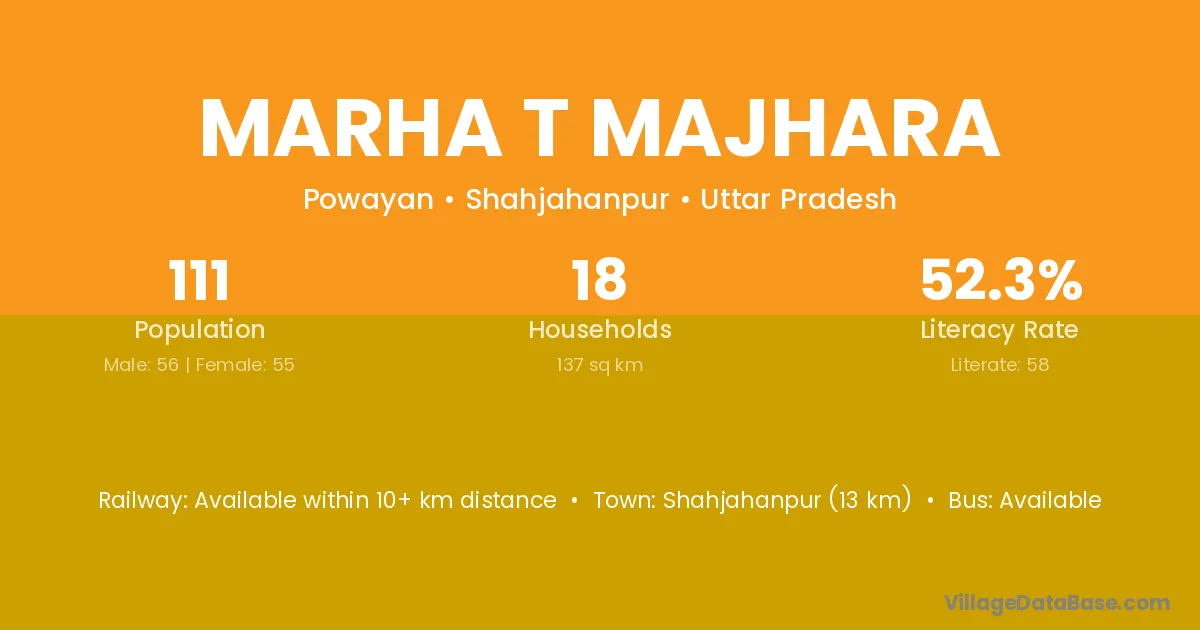 Shahjahanpur (13 km) is the nearest town to Marha T Majhara village for major economic activities and is located approximately 13 km away.