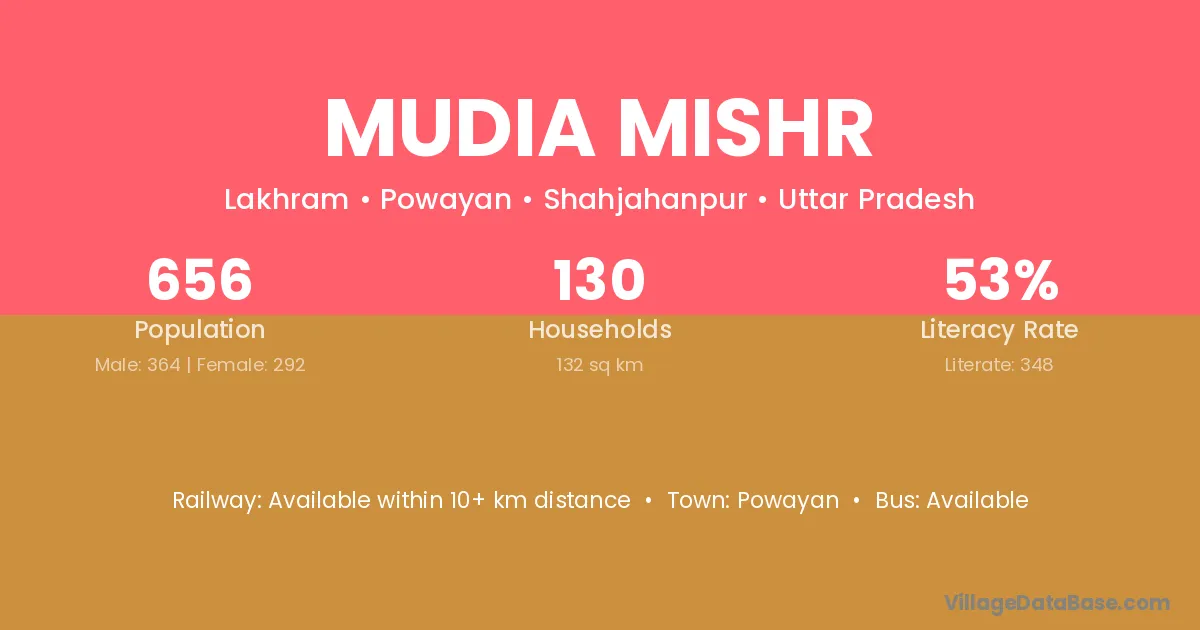 Mudia Mishr village has a total population of 656 people, of which 364 are males and 292 are females.