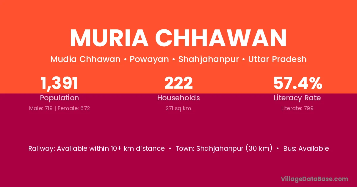 Shahjahanpur (30 km) is the nearest town to Muria Chhawan village for major economic activities and is located approximately 30 km away.