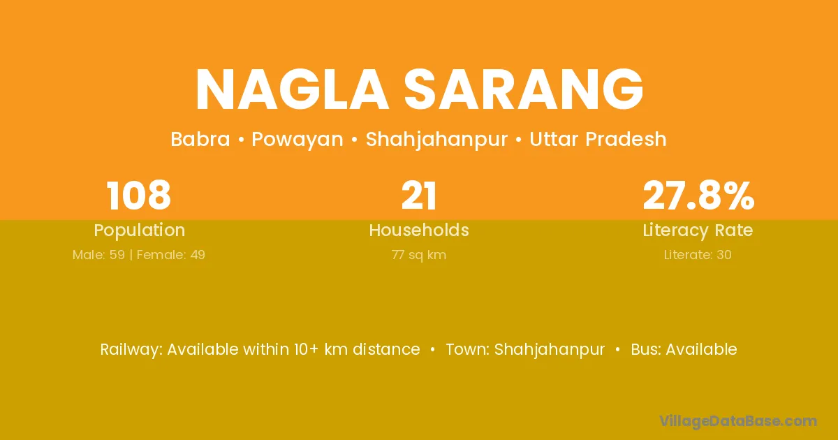 Nagla Sarang village has a total population of 108 people, of which 59 are males and 49 are females.