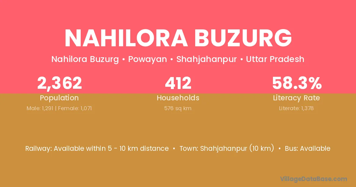 Shahjahanpur (10 km) is the nearest town to Nahilora Buzurg village for major economic activities and is located approximately 10 km away.