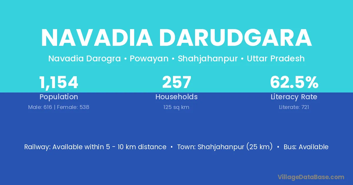 Shahjahanpur (25 km) is the nearest town to Navadia Darudgara village for major economic activities and is located approximately 25 km away.