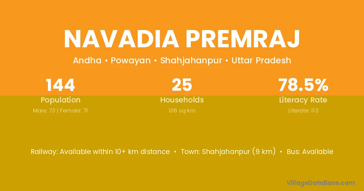 Shahjahanpur (9 km) is the nearest town to Navadia Premraj village for major economic activities and is located approximately 9 km away.