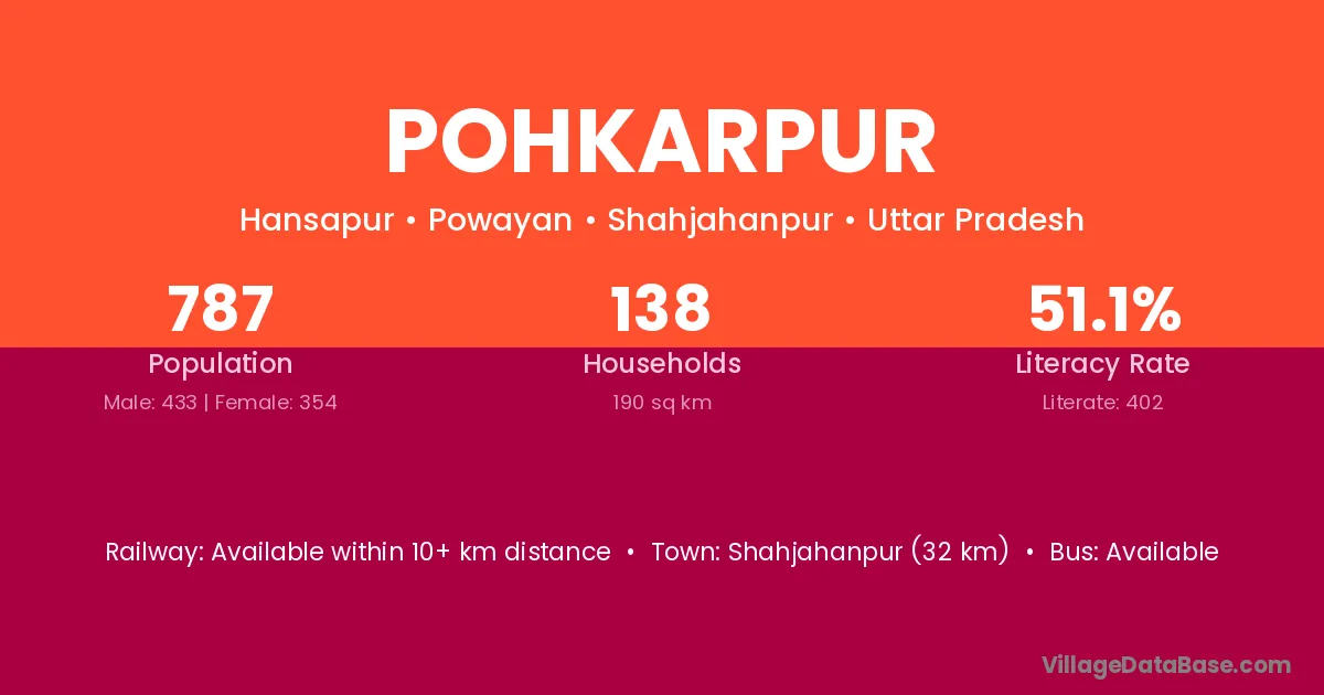 Shahjahanpur (32 km) is the nearest town to Pohkarpur village for major economic activities and is located approximately 32 km away.