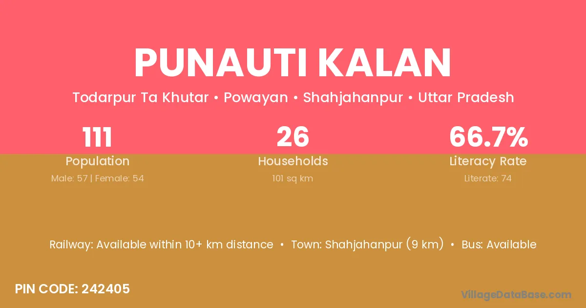 Shahjahanpur (9 km) is the nearest town to Punauti Kalan village for major economic activities and is located approximately 9 km away.