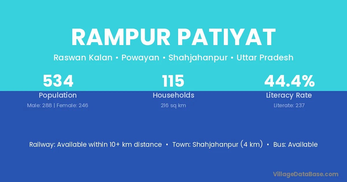 Shahjahanpur (4 km) is the nearest town to Rampur Patiyat village for major economic activities and is located approximately 4 km away.