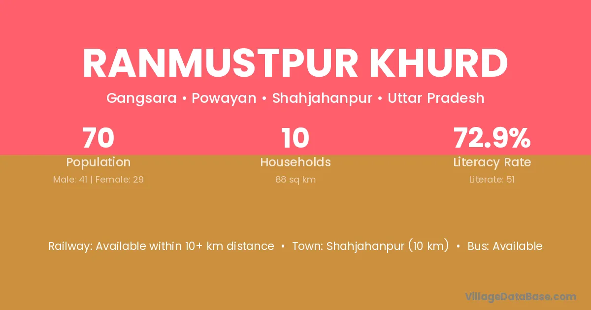 Shahjahanpur (10 km) is the nearest town to Ranmustpur Khurd village for major economic activities and is located approximately 10 km away.