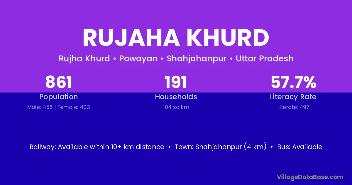 Shahjahanpur (4 km) is the nearest town to Rujaha Khurd village for major economic activities and is located approximately 4 km away.
