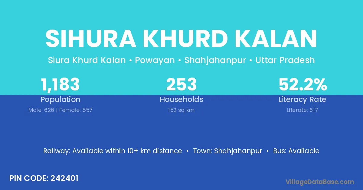 Sihura Khurd Kalan village has a total population of 1,183 people, of which 626 are males and 557 are females.