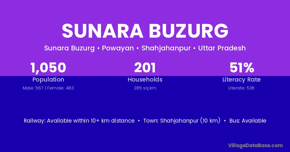 Shahjahanpur (10 km) is the nearest town to Sunara Buzurg village for major economic activities and is located approximately 10 km away.