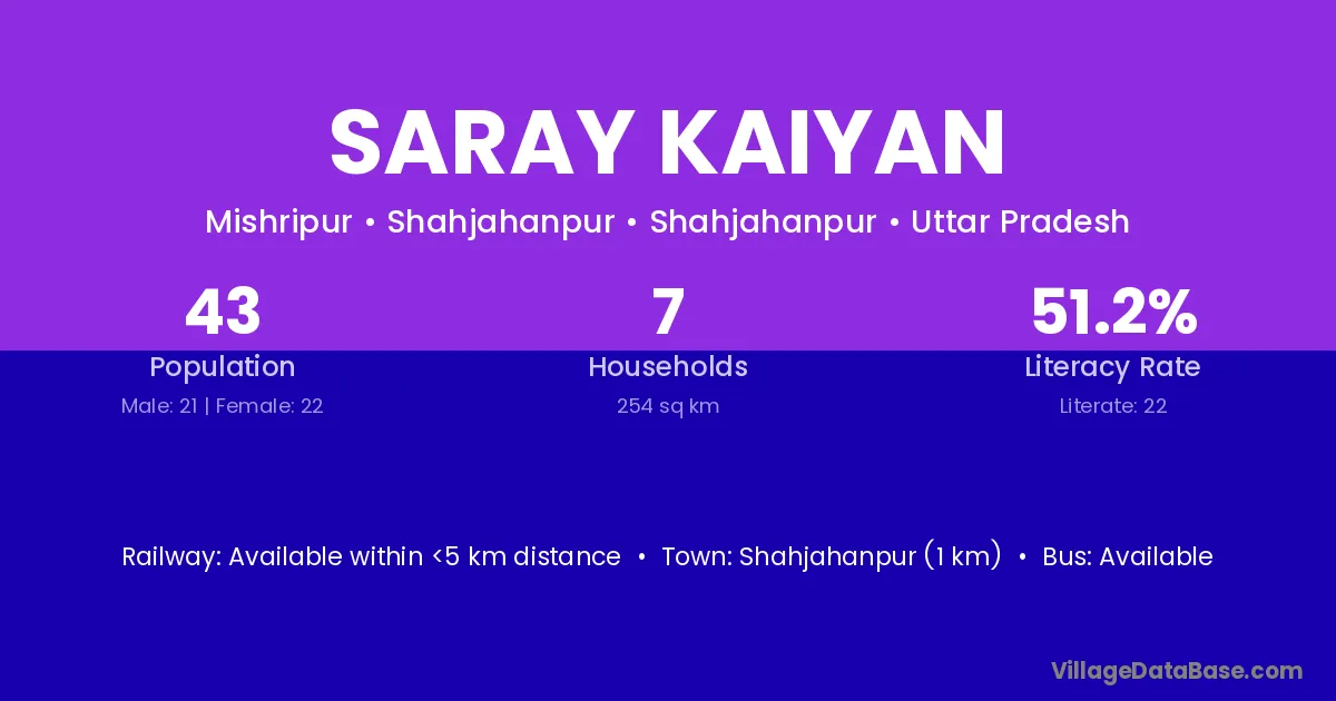 Shahjahanpur (1 km) is the nearest town to Saray Kaiyan village for major economic activities and is located approximately 1 km away.