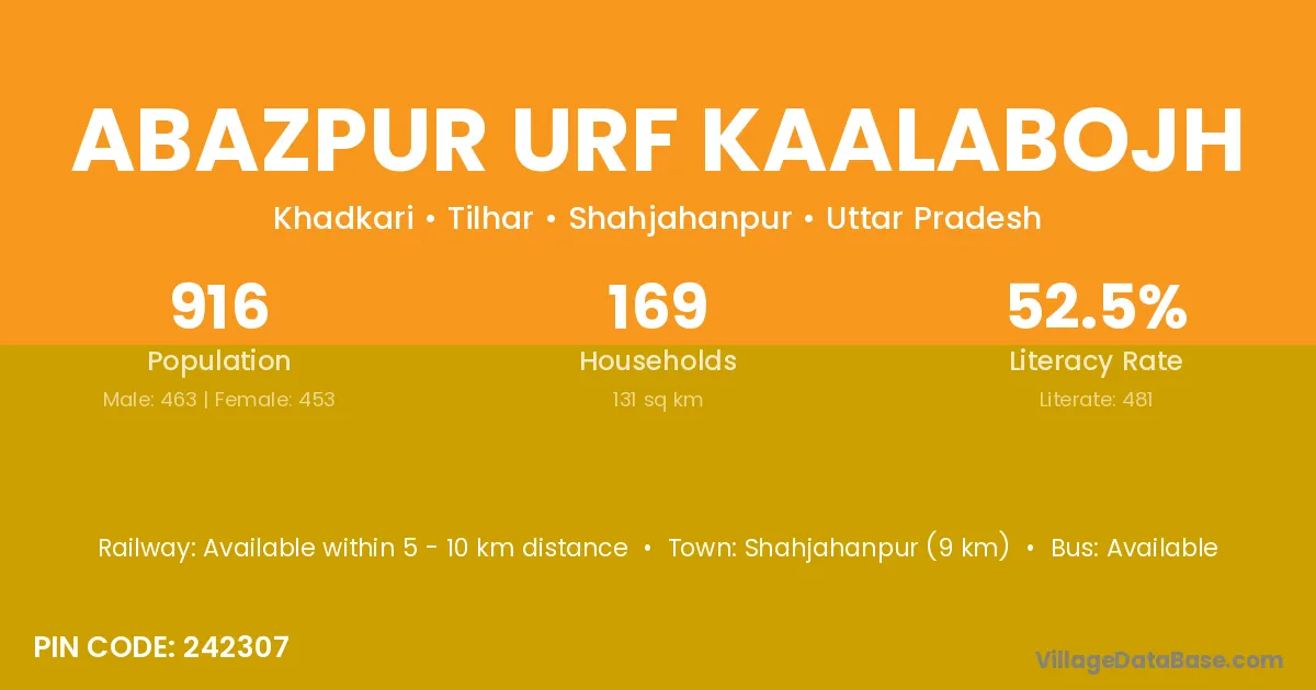 Abazpur Urf Kaalabojh village has a total population of 916 people, of which 463 are males and 453 are females.
